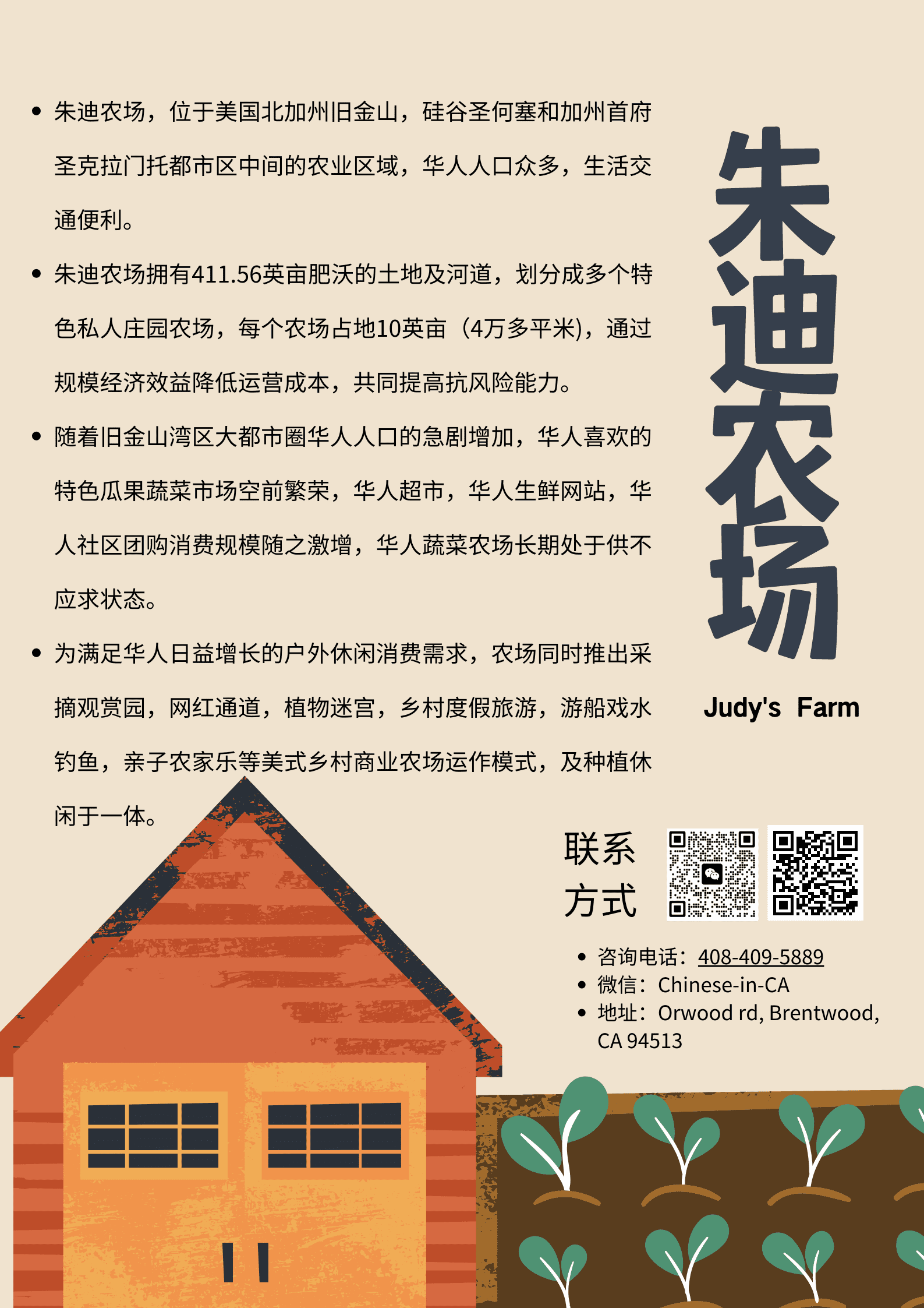 朱迪农场,位于美国北加州旧金山,硅谷圣何塞和加州首府圣克拉门托都市区中间的农业区域,华人人口众多,生活交通便利。