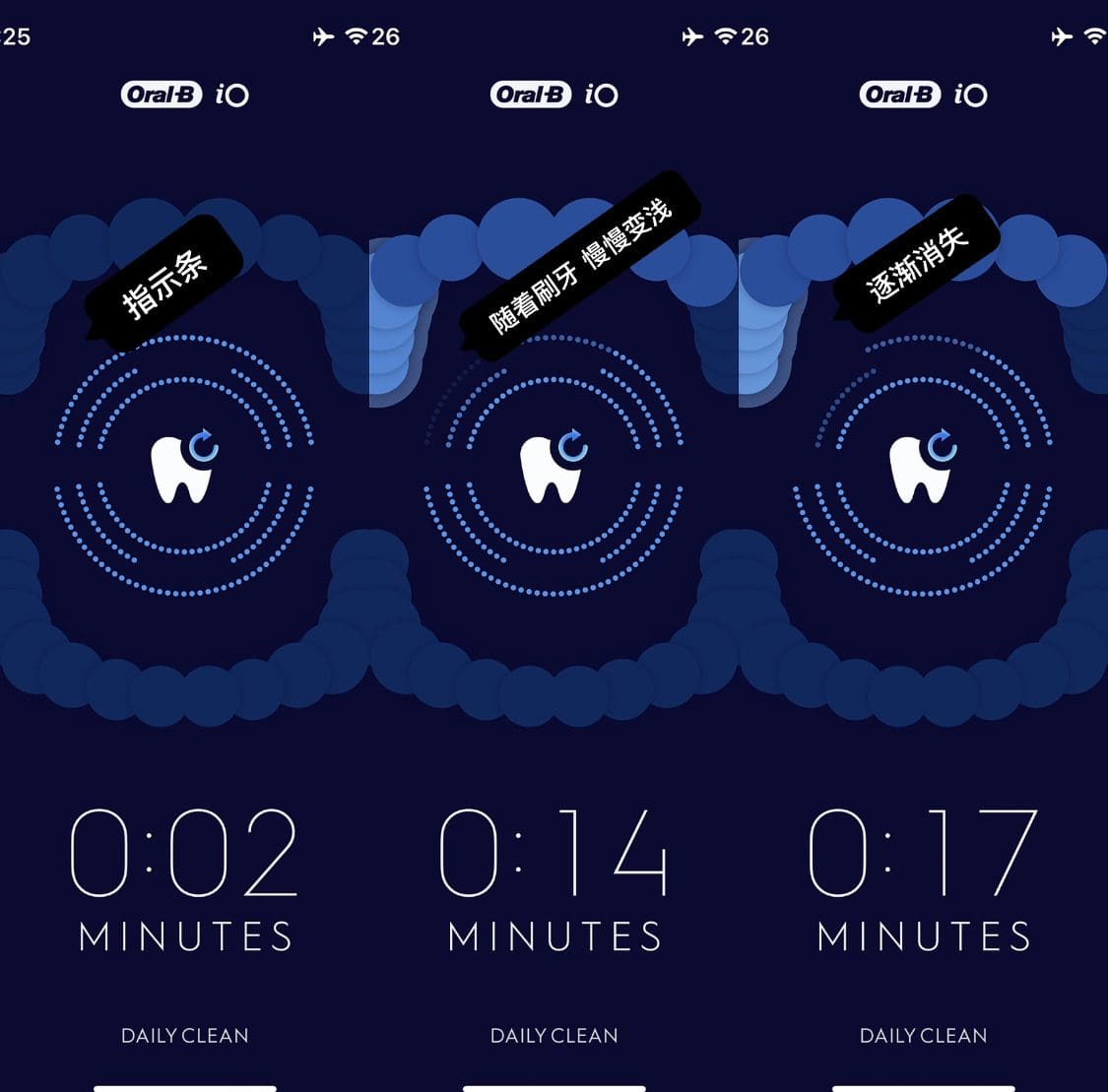 O家刷牙模式不仅把牙分成左中右上下六个区域,还把每个区域分成里面的牙齿,外面的牙齿,和牙齿平面。随着刷牙进度,指示条逐渐消失。之前用P家几乎不怎么开app,现在每次刷牙必开,就是因为这个提示功能。